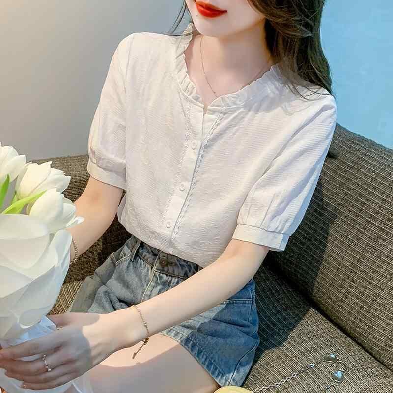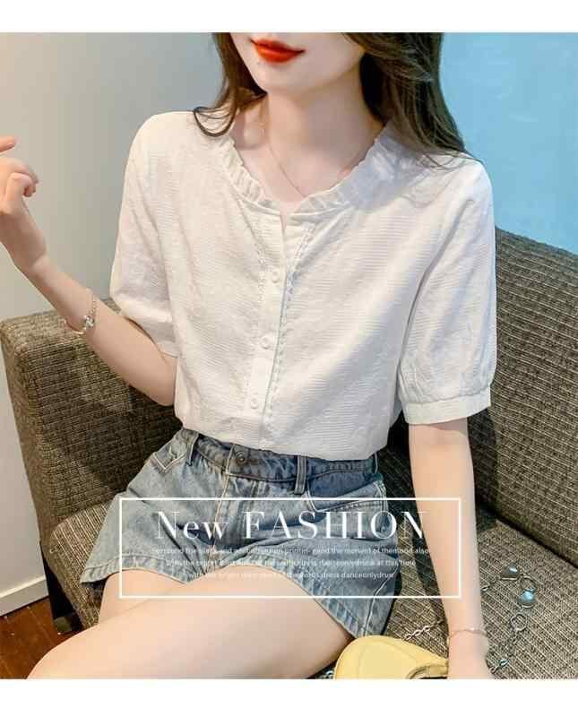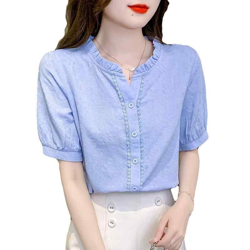 シャツ レディース 半袖 立襟 ブラウス 襟フリル 花柄 レース トップス カットソー アクリル ゆったり 通勤 オフィス カジュアル かわいい ホワイト ブルー