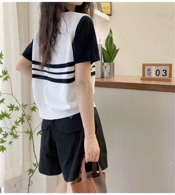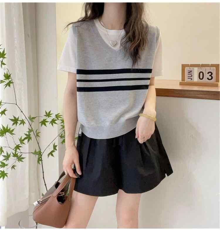 レディース ニットトップス 韓国風 スクールスタイル フェイクレイヤード ベスト風 半袖 ストライプ柄 配色デザイン グレー ポリエステル素材 スリムシルエット ショート丈 ラウンドネック カジュアル かわいい 普段使い