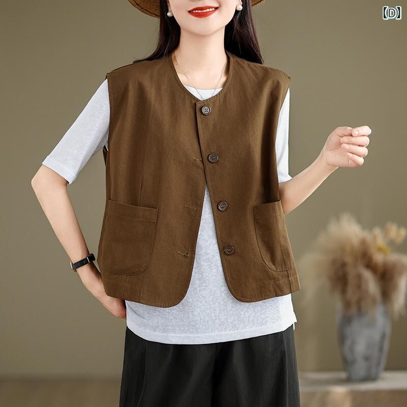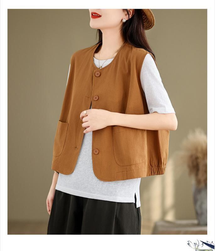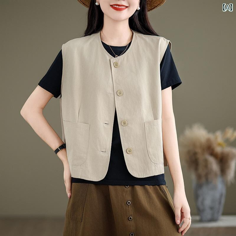 ベスト レディース ラウンドネック 綿 コットン ワークスタイル ノースリーブ ゆったり ルーズフィット レトロ カジュアル 着痩せ効果 ミドル丈 ボタン ポケット付き ライトカーキ ブラック