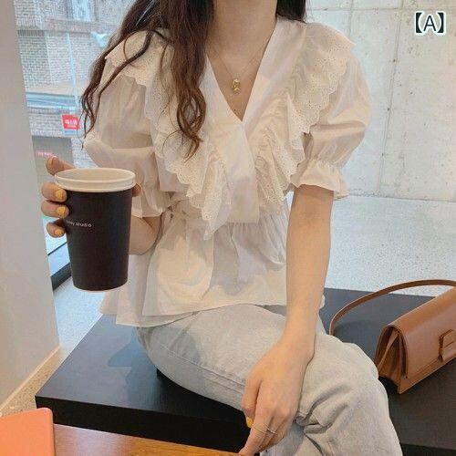 ブラウス シャツ レディース デザイン おしゃれ 小柄 細見え レース フリル 半袖 白 ホワイト アクリル Vネック チュニック