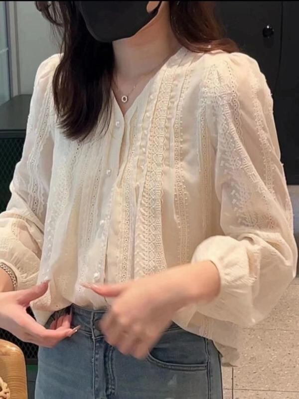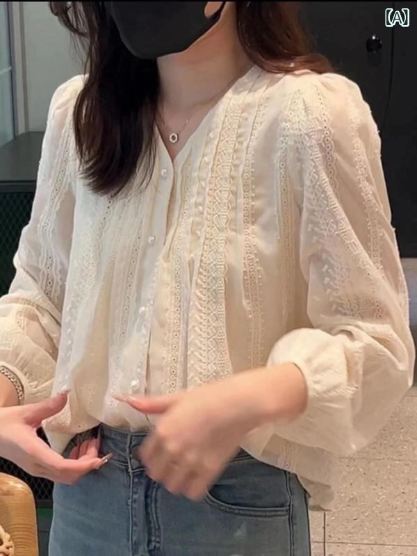 シャツ レディース 長袖 Vネック 刺繡 レース トップス ブラウス プルオーバー 杏色 ポリエステル 普段使い 通勤 オフィス エレガント フェミニン 上品 きれいめ 大人かわいい ランタンスリーブ