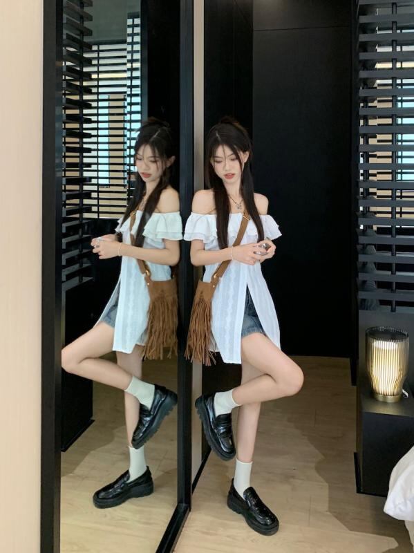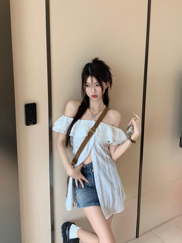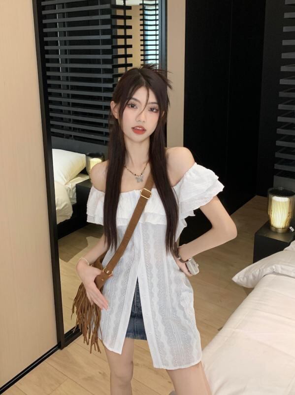 シャツ レディース 半袖 レース ブラウス 肩出し フリル襟 アクリル トップス 白 黒 通勤 オフィス きれいめ かわいい ガーリー フェミニン