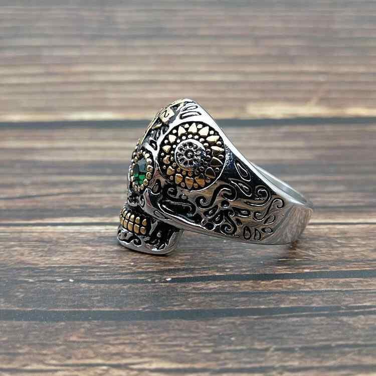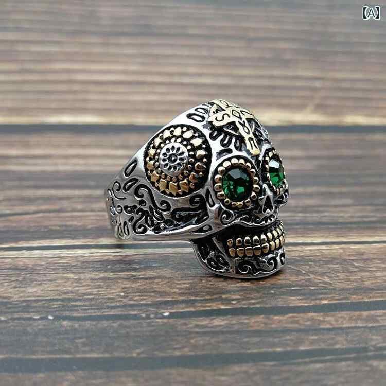 指輪 リング メンズ 男性用 パンク ロック スカル ドクロ チタン鋼 チタン製 彫刻 彫金 細工 緑目 レトロ ヴィンテージ ジルコニア ゴールド 金メッキ ファッション カジュアル 普段使い