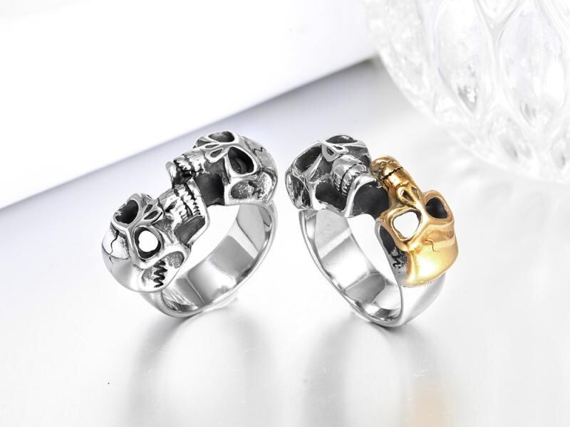 指輪 リング メンズ ダブルスカル チタン鋼 欧米風 個性派 幾何学デザイン シルバー ゴールド ツートンカラー カジュアル ストリート ファッション アクセサリー 男性用