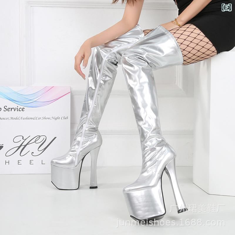 ニーハイブーツ ユニセックス 20cm超高ヒール 厚底 ラウンドトゥ PUレザー コスプレ撮影用 ポールダンス ステージ ナイトクラブ ランウェイ パフォーマンス 大きいサイズ