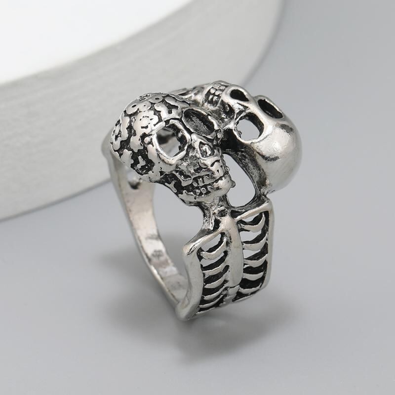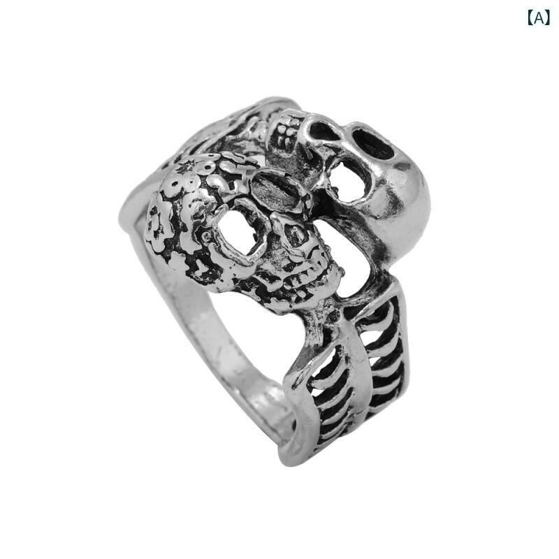 指輪 メンズ 男性用 双頭 スカル オープンリング 欧米風 サイズ調節可能 HIP HOP 学生 パーティー クール 合金 シルバー 電気メッキ加工