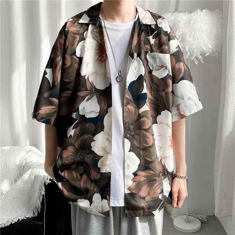 シャツ メンズ レトロ 油絵風プリント 半袖 五分袖 ゆったり オーバーサイズ ルーズフィット オープンカラー 総柄 花柄 ポリエステル 薄手 春夏 カジュアル 普段使い ブラウン