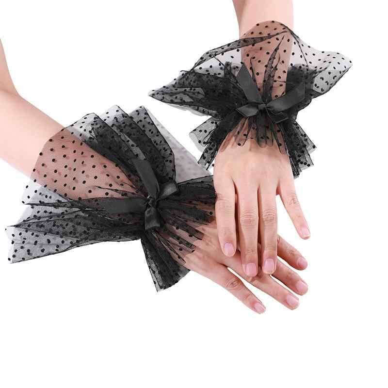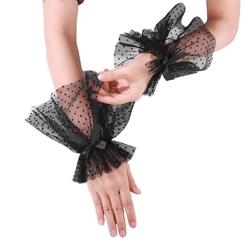 アームカバー レディース 春夏 メッシュ素材 通気性抜群 リボン付き ブラック ドット柄 レース 上品 UVカット 紫外線対策 おしゃれ ファッション小物