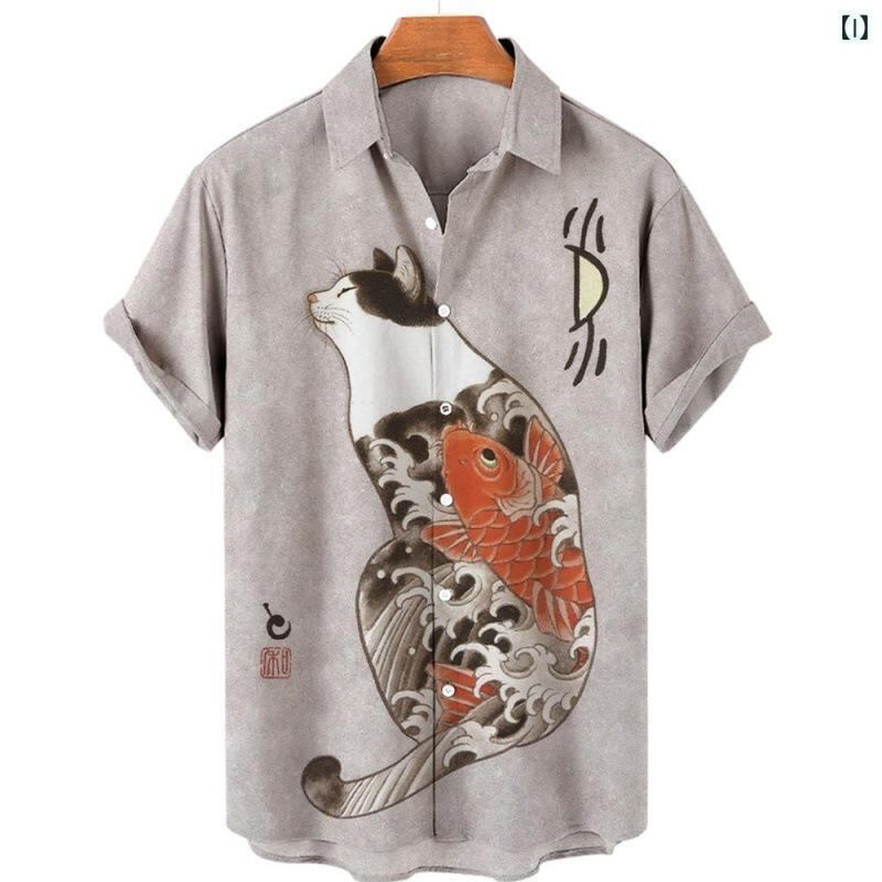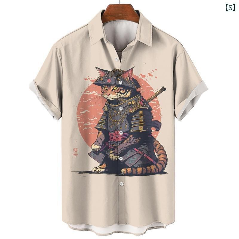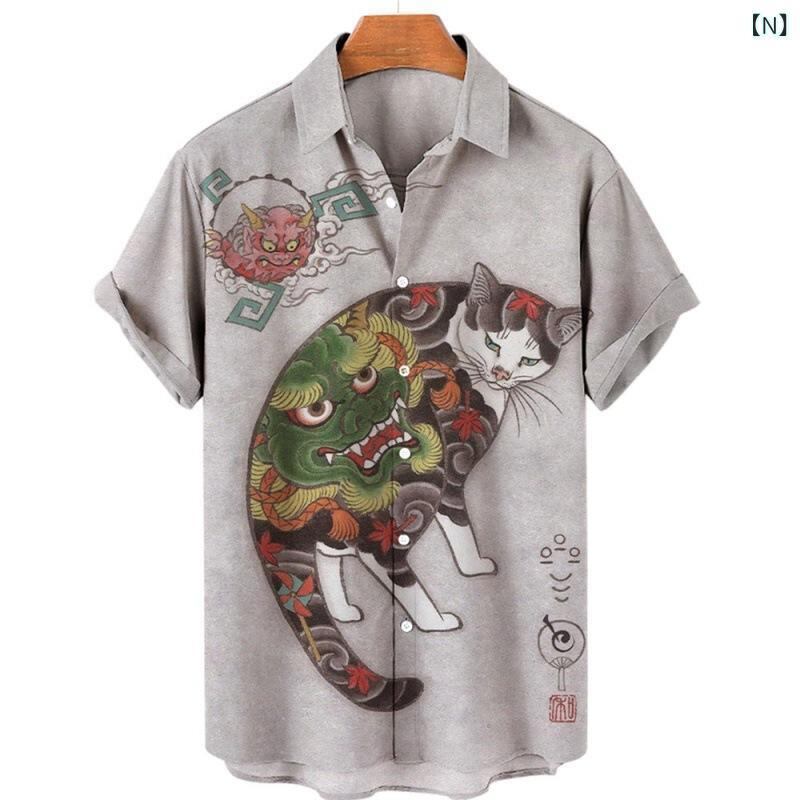 シャツ メンズ 半袖 開襟シャツ 夏 サマー 3Dプリント 和風 侍猫柄 ハワイアン カジュアル ゆったり リラックスフィット 速乾 ポリエステル 伸縮性 旅行 リゾート アウトドア
