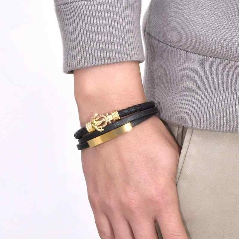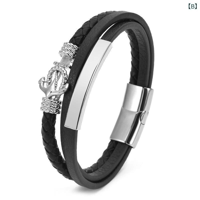 ブレスレット メンズ ステンレス アンカー 合成皮革 手編み 多重巻き マグネット留め具 電気メッキ加工 ゴールド シルバー ジオメトリック パンクスタイル カジュアル 通勤 春夏