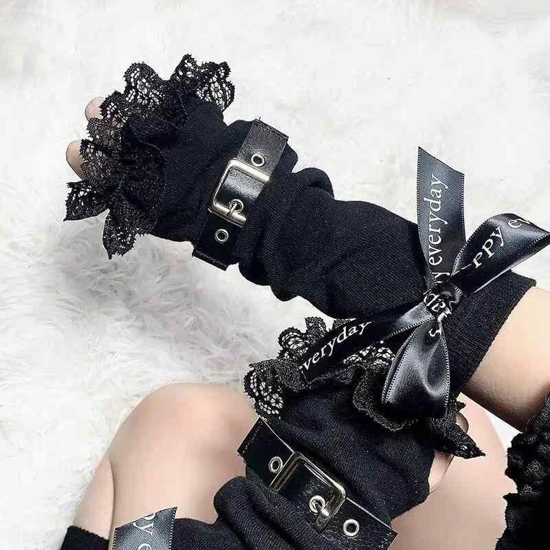 グローブ アームカバー ゴシック ロリータ 原宿系 ストライプ 革バックル リボン レース UVカット 日焼け対策 春夏 ダーク系