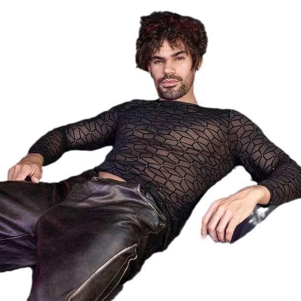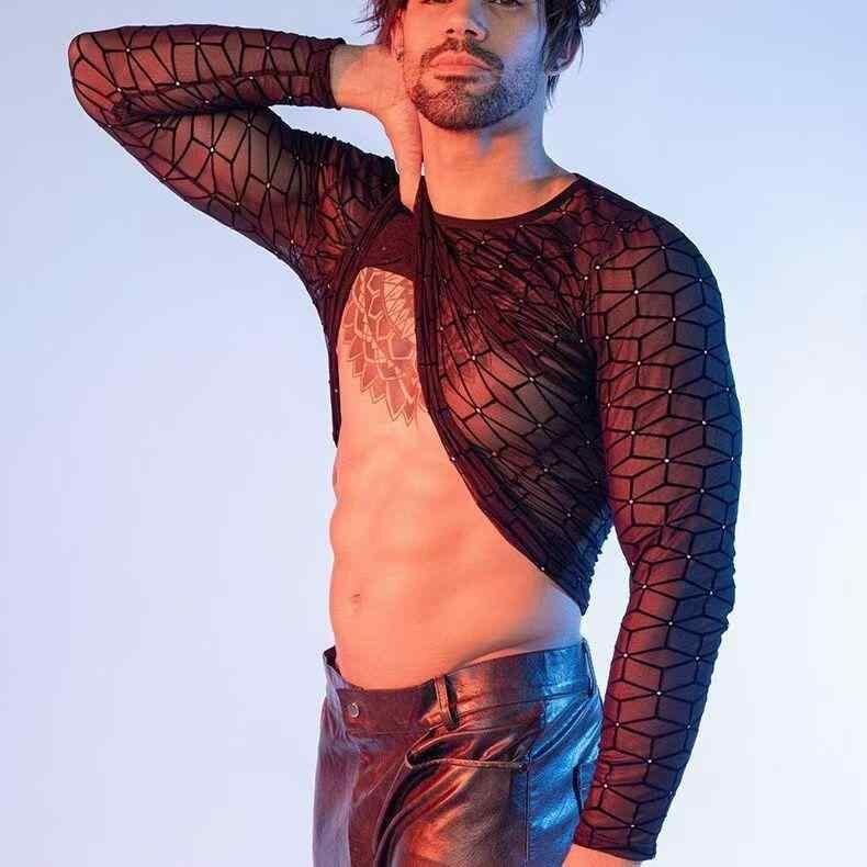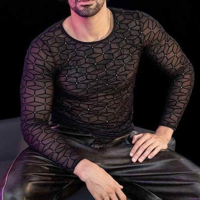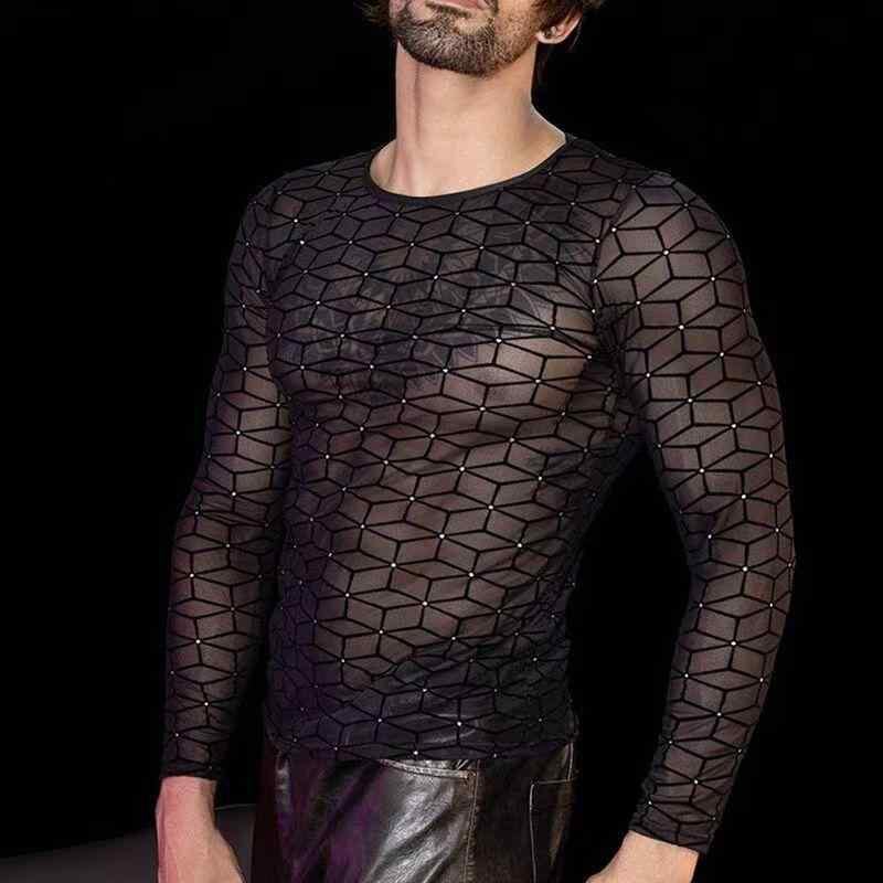 Tシャツ メンズ 男性用 メッシュ 長袖 ドロップショルダー シースルー 透け感 セクシー 大人カジュアル ナイトクラブ ダンス フィットネス ジム トレーニングウェア 通気性 速乾 スタンドカラー ポリエステル ブラック トップス