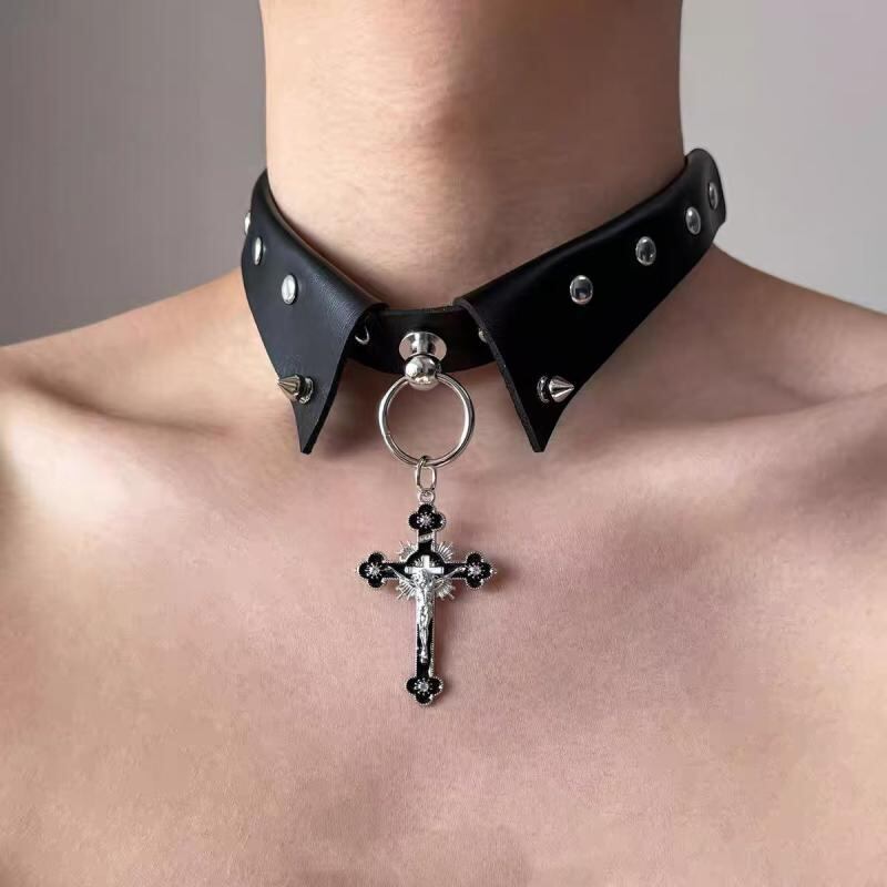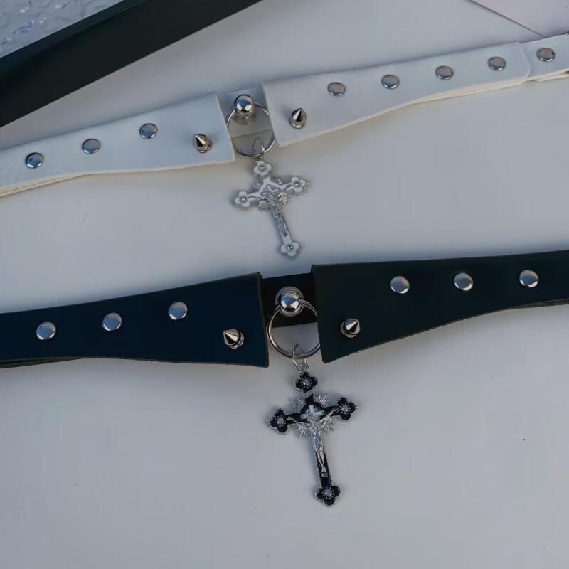 ネックレス 男女兼用 ダーク パンク ゴシック ロック フェイクカラー クロス チョーカー 鎖骨チェーン 個性的 存在感 欧米風 クール スタイリッシュ フェイクレザー 合金製 ブラック ホワイト