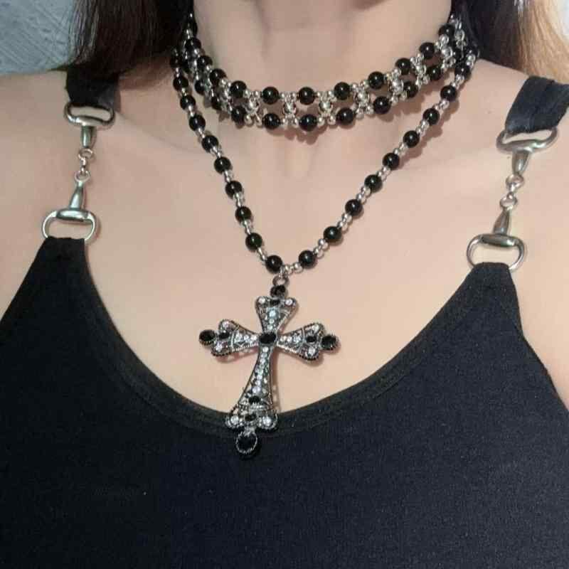 ネックレス レディース 二連 ビーズ クロス 十字架 欧米風 ダーク ゴシック パンク 個性的 クール トレンド ロングネックレス 秋冬