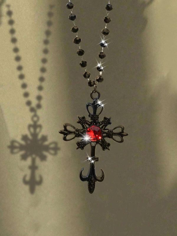 ネックレス 男女兼用 ゴシック パンク ダーク レトロ調 十字架 クロス ペンダント レッドストーン埋め込み 亜鉛合金製 おしゃれ 個性的 ファッション小物 クロスチェーン