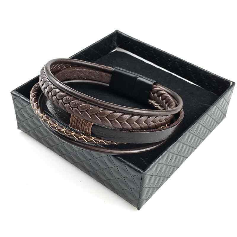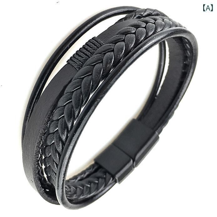 ブレスレット 腕輪 メンズ 男性用 牛革紐 編み込み 高級感 合金 マグネットクラスプ 磁石留め具 幾何学模様 カジュアル 個性的 パンク ブラック ブラウン 普段使い