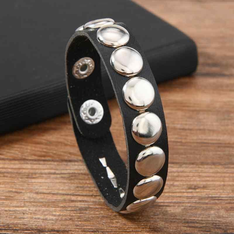 ブレスレット 男女兼用 パンク ゴシック スタイル 欧米風 円形 リベット スナップボタン 調節可能 アジャスター付き レザー 革 カップル ペア ブラック ホワイト レッド ダークブラウン