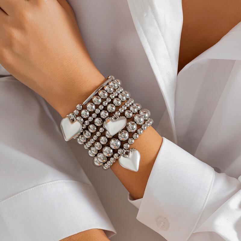ブレスレット レディース 重ね付け 伸縮性 ハートチャーム 丸玉ビーズ 欧米風 パンクテイスト 合金製 シンプル 秋冬 通勤 オフィス