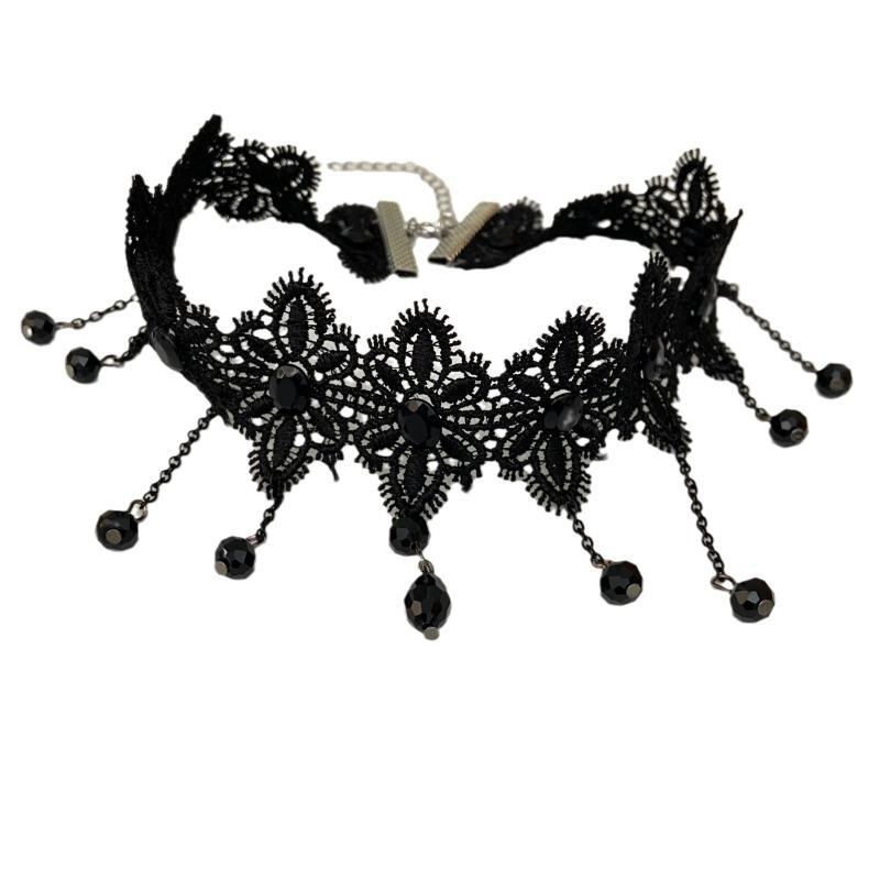 ネックレス レディース ダーク パンク ゴシック 甘辛 サブカルチャー レース ティアドロップ フリンジ 人工水晶 チョーカー 個性的 秋冬