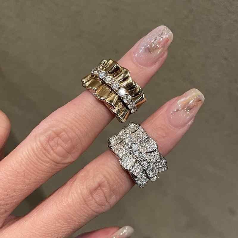 指輪 レディース レトロ ヴィンテージ風 軽奢 ラグジュアリー エレガント 上品 通勤 幅広 ワイド スカート プリーツ シルクサテン ジルコニア 人差し指リング シルバー 銅 電気メッキ加工 春夏