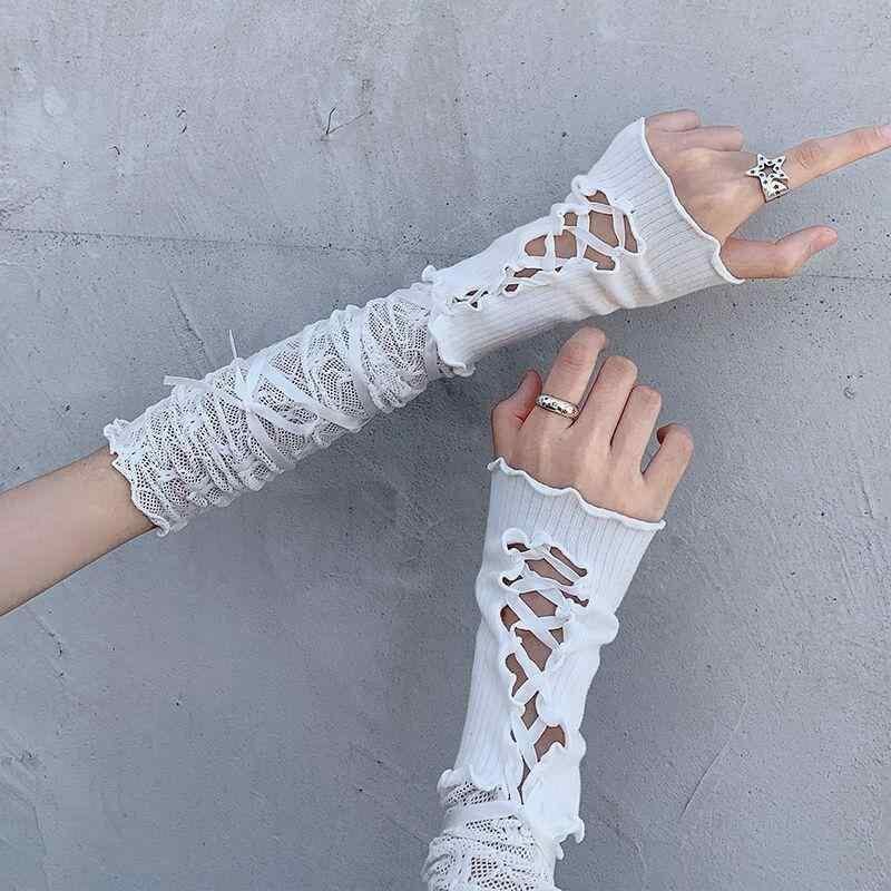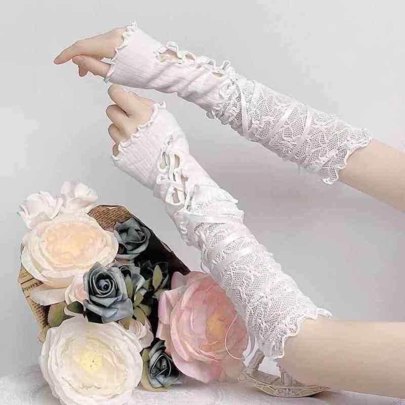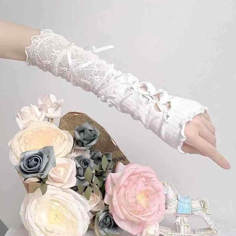 アームカバー レディース ロリータ レースアップ レース バレエ風 リボン付き 切り替え 甘辛スタイル コスプレ ダンス 衣装 綿素材 白 黒 春夏 かわいい フェミニン