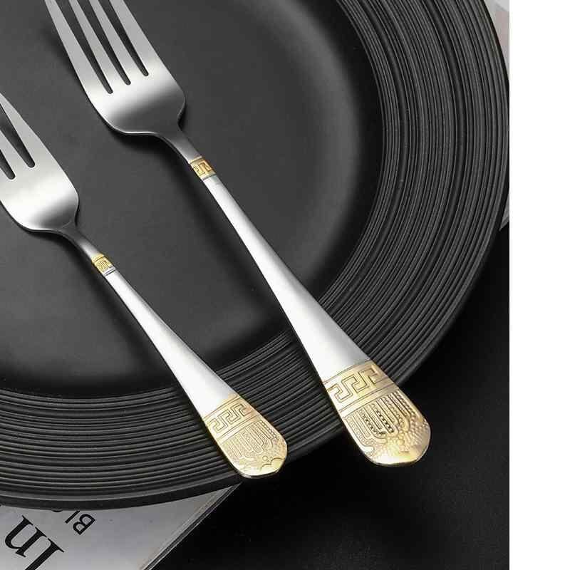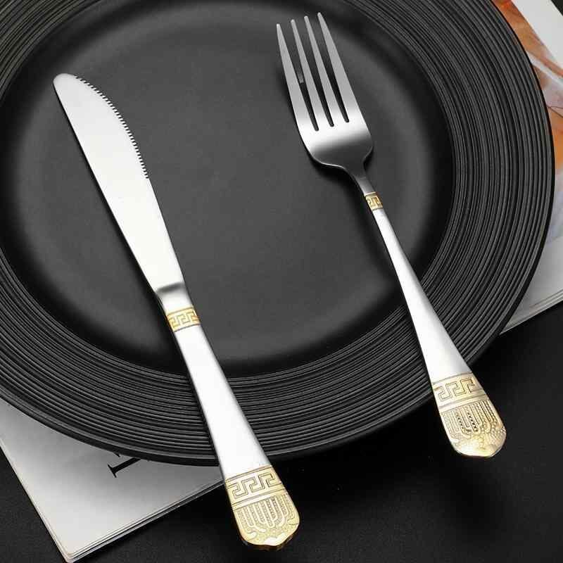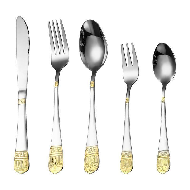 カトラリーセット ステンレス製 ナイフ フォーク スプーン デザートフォーク デザートスプーン 5点セット ゴールド 金メッキ クラウン 模様入り 鏡面仕上げ シンプル 高級感 ホテル ステーキ 洋食 普段使い 来客用