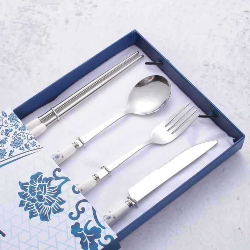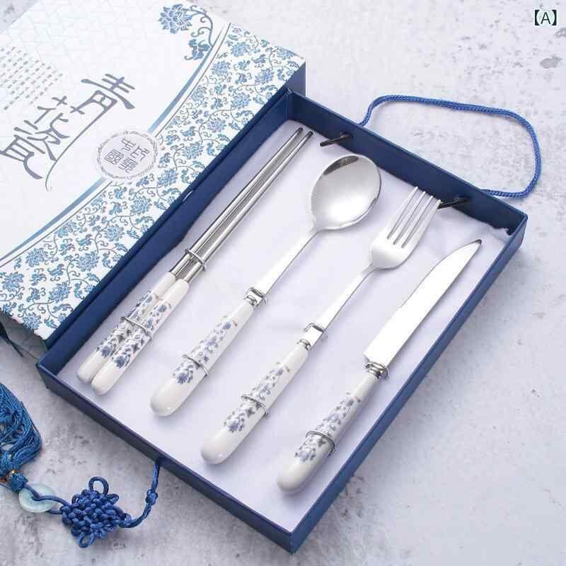 カトラリーセット 410ステンレス ナイフ フォーク スプーン 箸 中国風 青花磁器柄 モダン シンプル 鏡面仕上げ 高品質 上質 食卓用