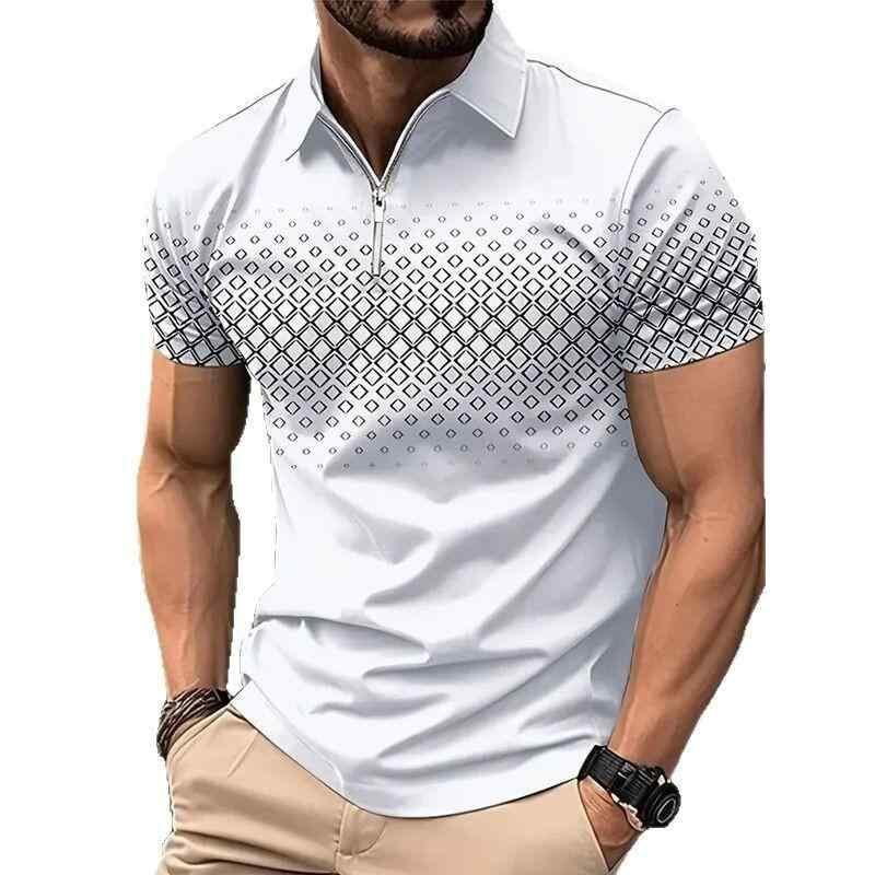 ポロシャツ メンズ 春夏 ファッション 半袖 ジップアップ 3D格子柄 プリント ポリエステル 通気性 スポーツ カジュアル スリムフィット ウォッシャブル