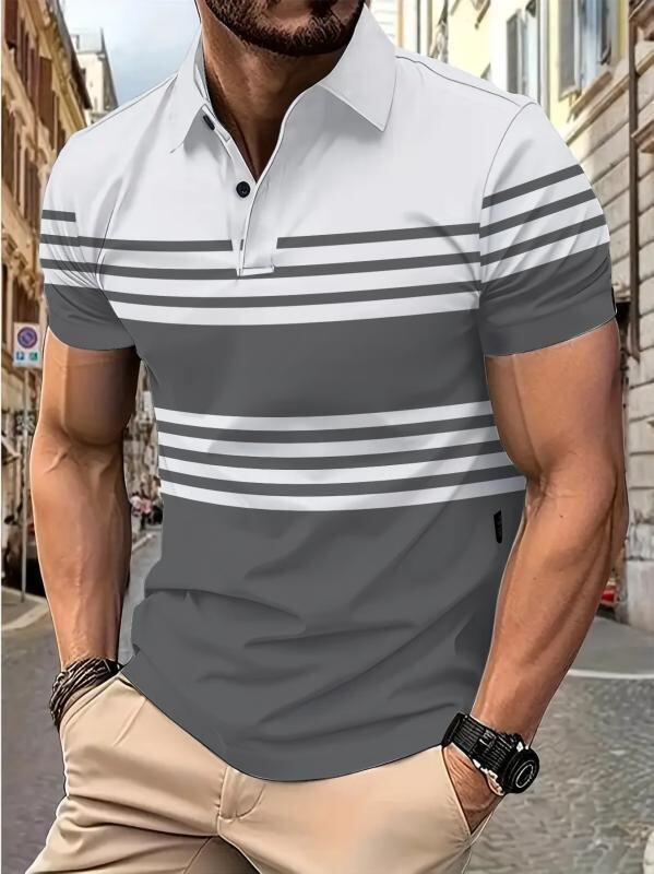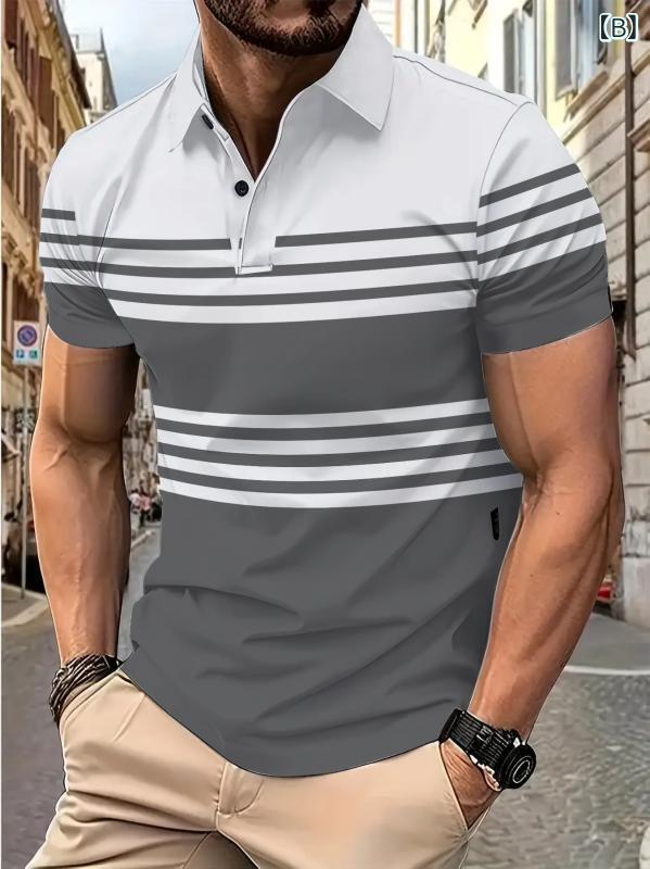 ポロシャツ メンズ ストライプ 3Dデジタルプリント 半袖 春夏 カジュアル デイリーユース 大人カジュアル スリムフィット ポリエステル 通気性 ウォッシャブル ネイビー グレー カーキ ワインレッド
