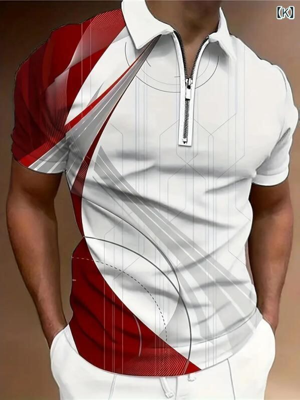 ポロシャツ メンズ 男性用 半袖 スポーツ カジュアル 幾何学模様 ジオメトリック柄 3Dデジタルプリント ファスナー ジップ ポリエステル混紡 ゆったり ルーズフィット 夏 きれいめカジュアル 高耐久性