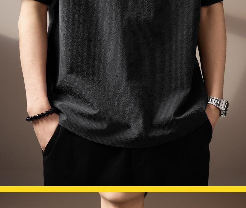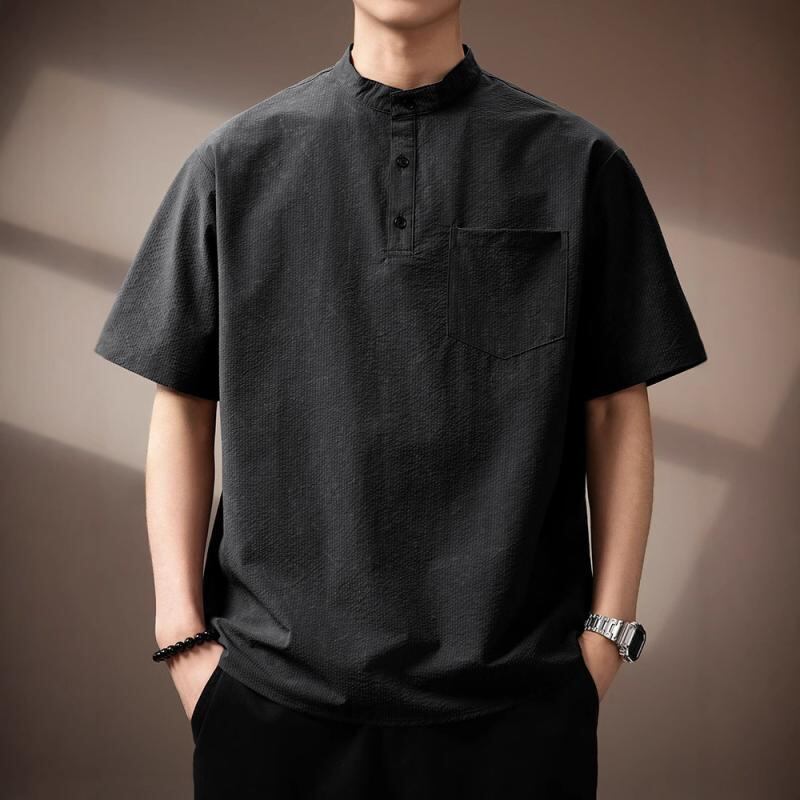ポロシャツ メンズ 高級感のある スタンドカラー レトロ 薄手 軽量 接触冷感 五分袖 凹凸感のある生地 ポリエステル ゆったり ドロップショルダー カジュアル 春夏 トップス