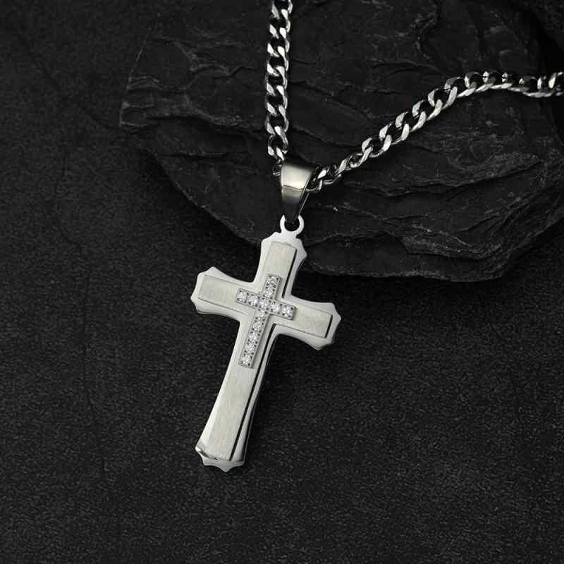 ネックレス メンズ ステンレス チタン鋼 十字架 ジルコニアストーン ペンダント キューバンチェーン 個性的 欧米風 スタイリッシュ 高級感 シルバー ゴールド ブラックゴールド