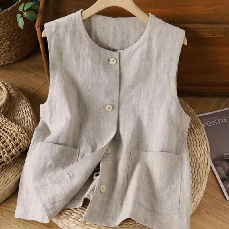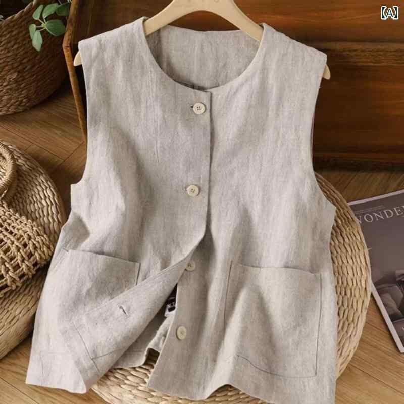 ベスト レディース ノースリーブ クルーネック 丸首 麻 綿麻 リネン ゆったり ルーズ カジュアル オープンフロント 上品 エレガント レトロ 通勤 着回し トップス ジレ
