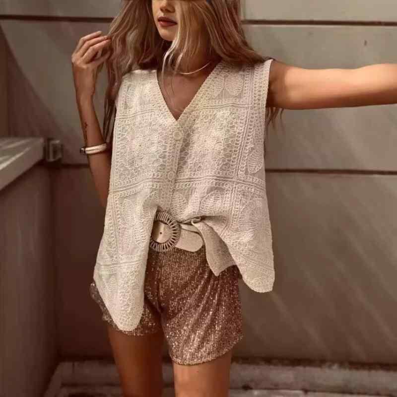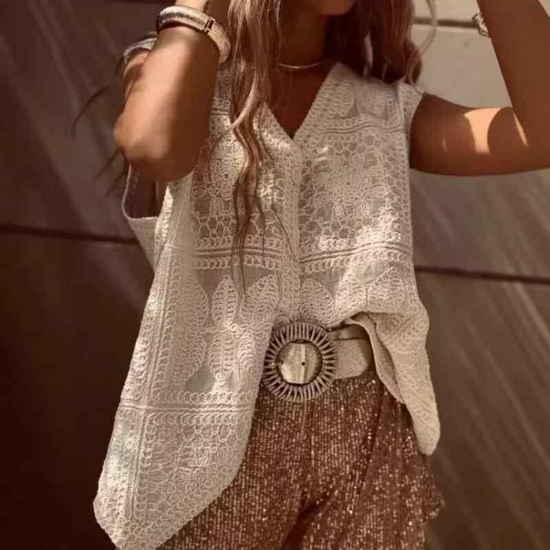 ベスト レディース Vネック かぎ編み クロシェ ニット ジレ 薄手 オープンフロント 通勤 オフィス カジュアル ポリエステル 再生繊維 ホワイト ベージュ