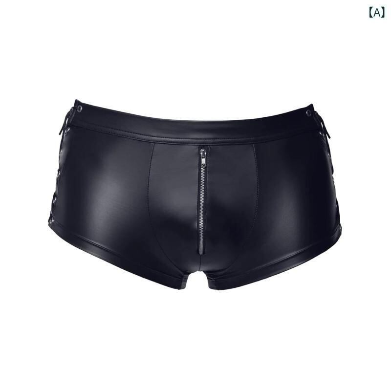 下着 メンズ 男性用 セクシー ボクサーパンツ アンダーウェア フェイクレザー エナメル調 光沢 ローライズ 伸縮性 カットアウト ひも付き ブラック