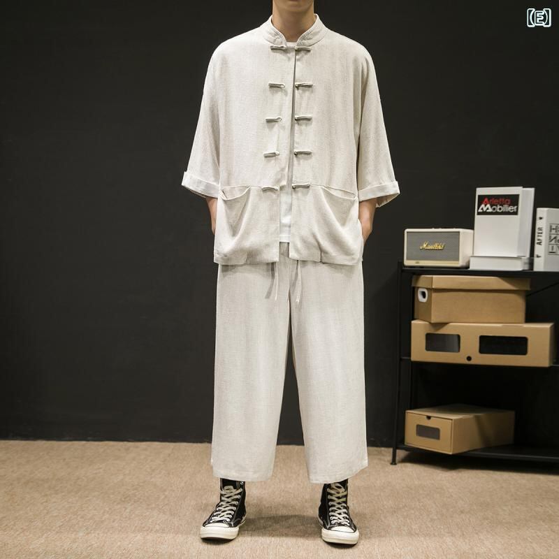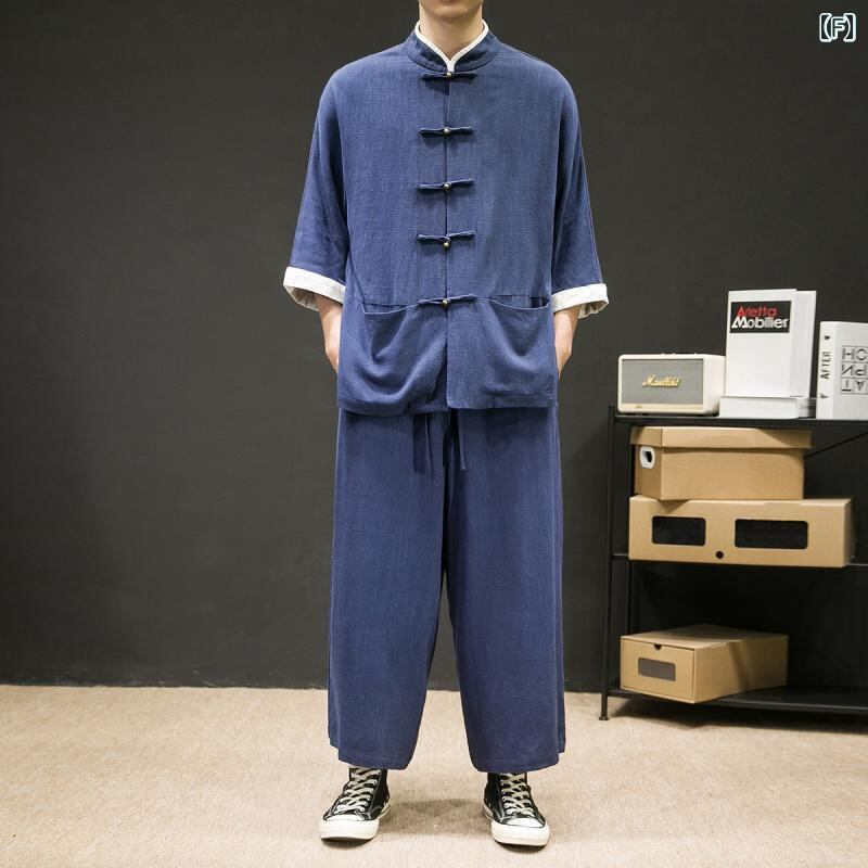 セットアップ メンズ 男性用 麻 リネン 春夏 薄手 中国風 古風 チャイナ風 ゆったり ルーズフィット 半袖 シャツ トップス チャイナシャツ カジュアル リラックス 部屋着