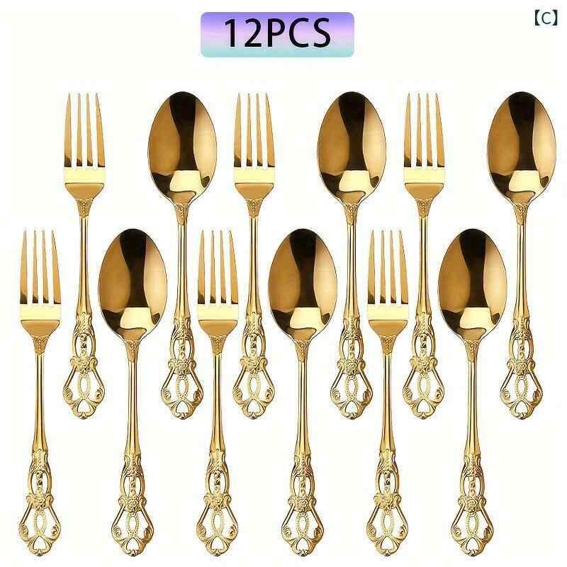 カトラリー ステンレス製 ロイヤル 宮廷風 ゴールド デザートフォーク コーヒースプーン セット レトロ 高級感 華麗 鏡面仕上げ 花柄 テーブルウェア