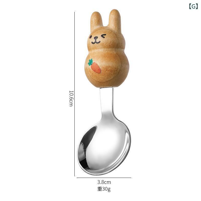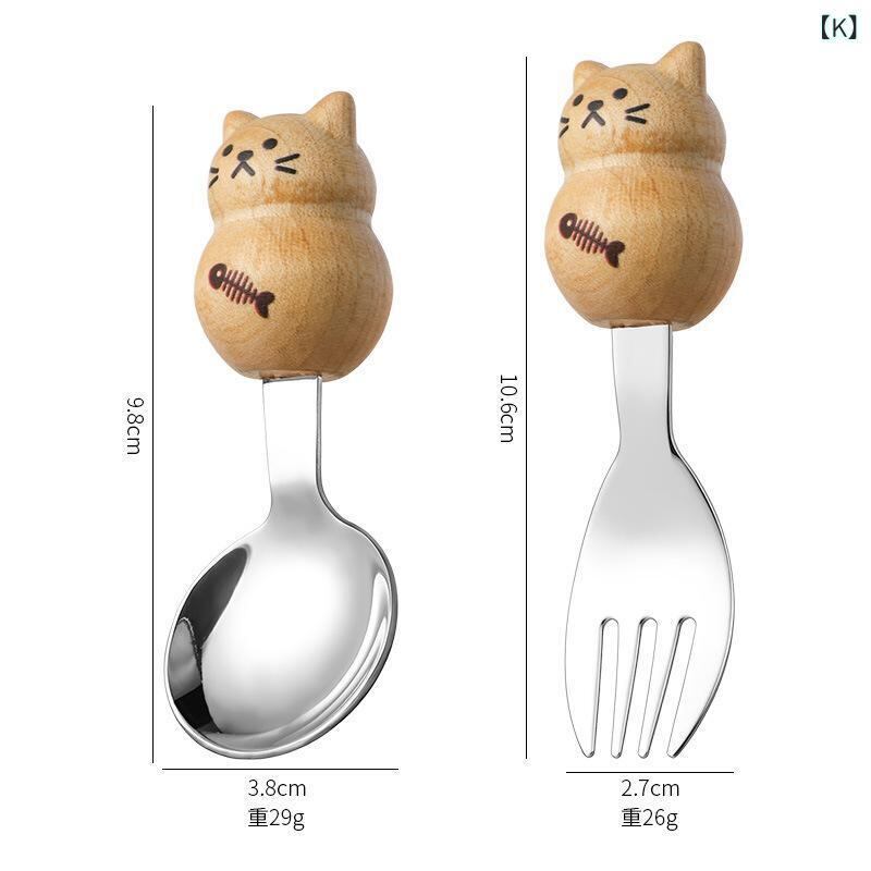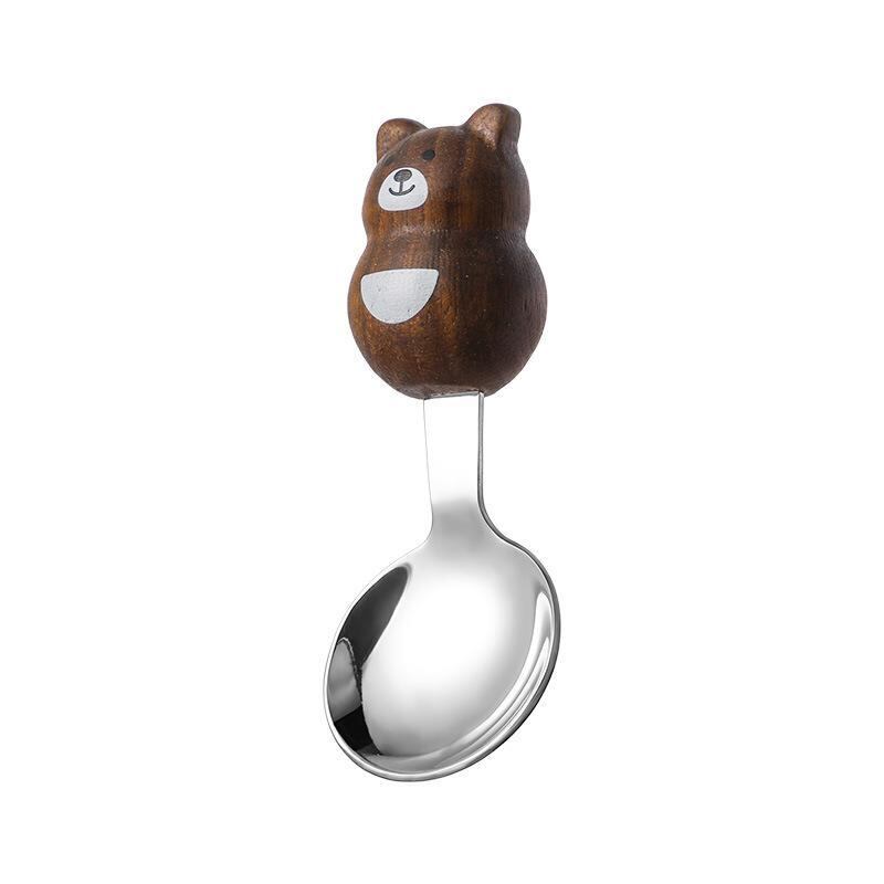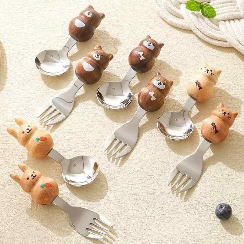 カトラリー キッズ 子供用 304ステンレス ウォールナット 白楓木 木製 キャラクター かわいい ペットモチーフ クマ イヌ ネコ ウサギ スプーン フルーツフォーク セット
