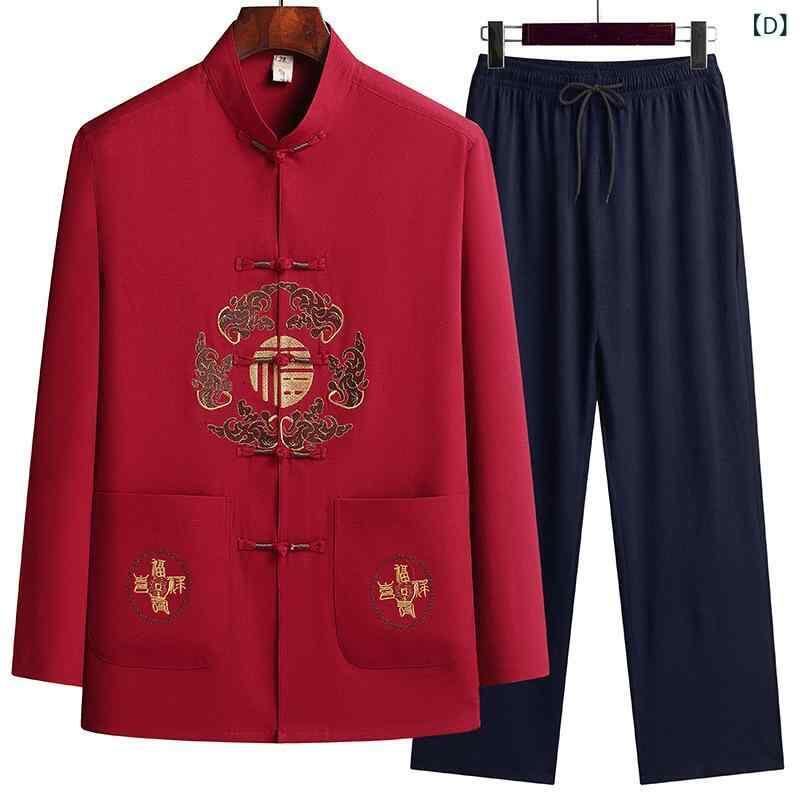 唐装 メンズ 中高齢男性用 春夏 長袖 シャツ セットアップ 薄手 ポリエステル素材 刺繡入り 中国風 カジュアルウェア 普段使い 父の日 祖父向け