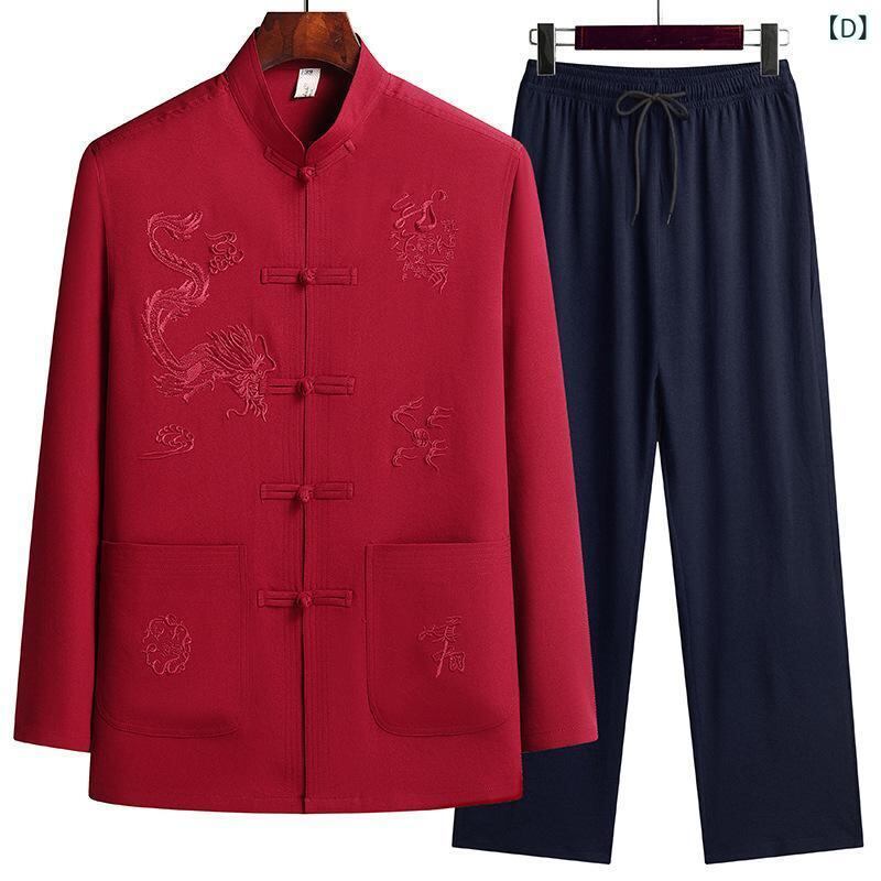 チャイナ服 メンズ シニア 中高年男性 中国風 唐装スタイル 綿麻調 長袖 上下セット セットアップ 刺繡デザイン ポリエステル素材 春夏 リラックスウェア 普段使い ルームウェア