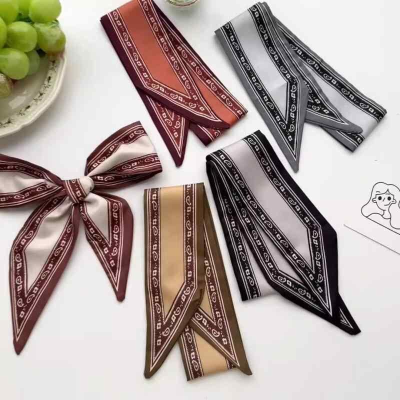 リボン スカーフ レディース 細幅 ロング 春夏 韓国風 万能 バッグチャーム ヘアバンド ペイズリー柄 無地 ポリエステル製 エレガント シンプル 斜めカット