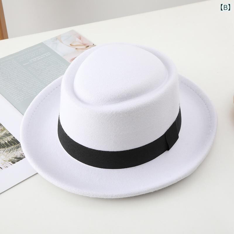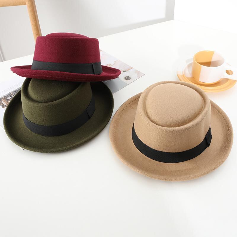 ハット フェドラハット ブリティッシュスタイル ブラックリボン 平天型 くぼみ カーブつば ポリエステルフェルト UVカット 防風 保温 秋冬