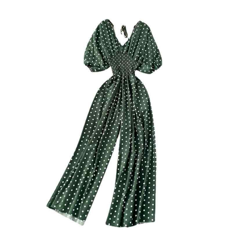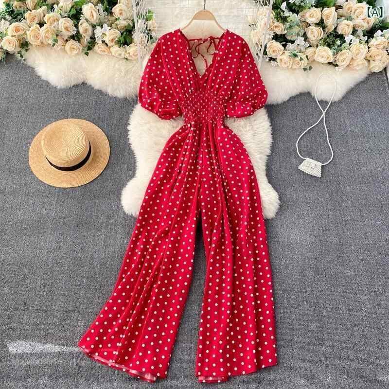 オールインワン コンビネゾン レディース ファッションブロガー風 リゾートスタイル ドット柄 パフスリーブ 半袖 ウエストマーク 細見え ロング丈 ワイドパンツ きれいめ カジュアル 春夏