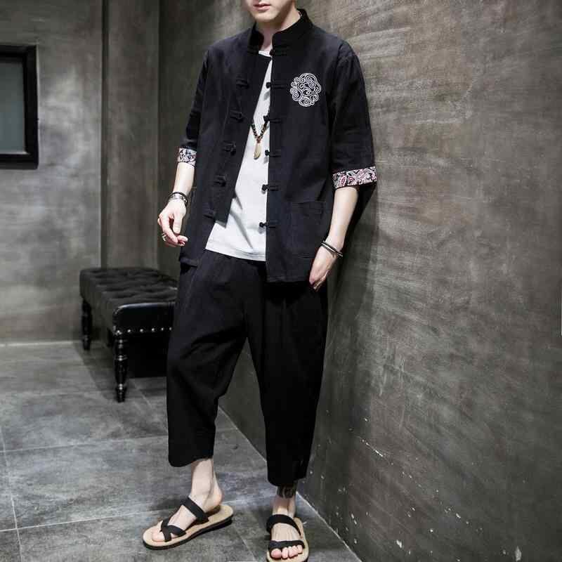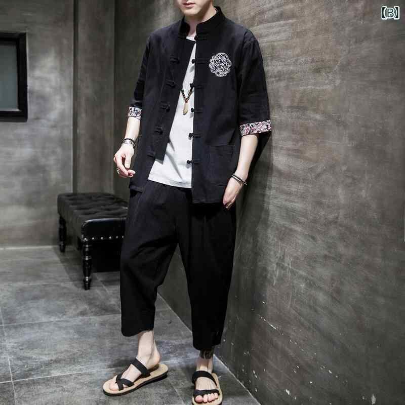 チャイナ服 男性 中高年 半袖 セットアップ 春夏 薄手 麻 リネン 通気性 涼しい ゆったり 中華風 中国風 カジュアル リラックスウェア 部屋着 普段使い 太極拳 稽古着