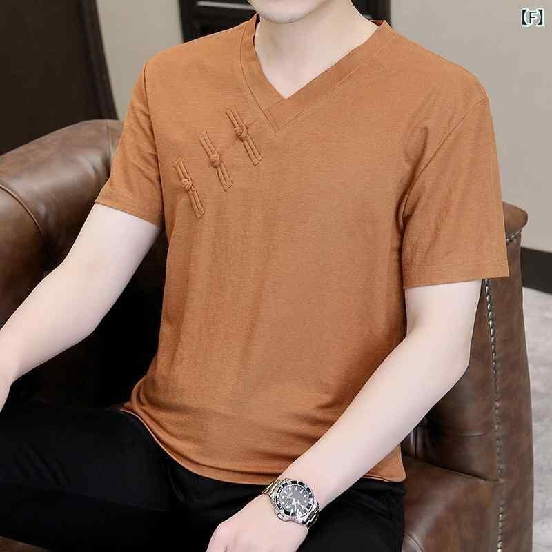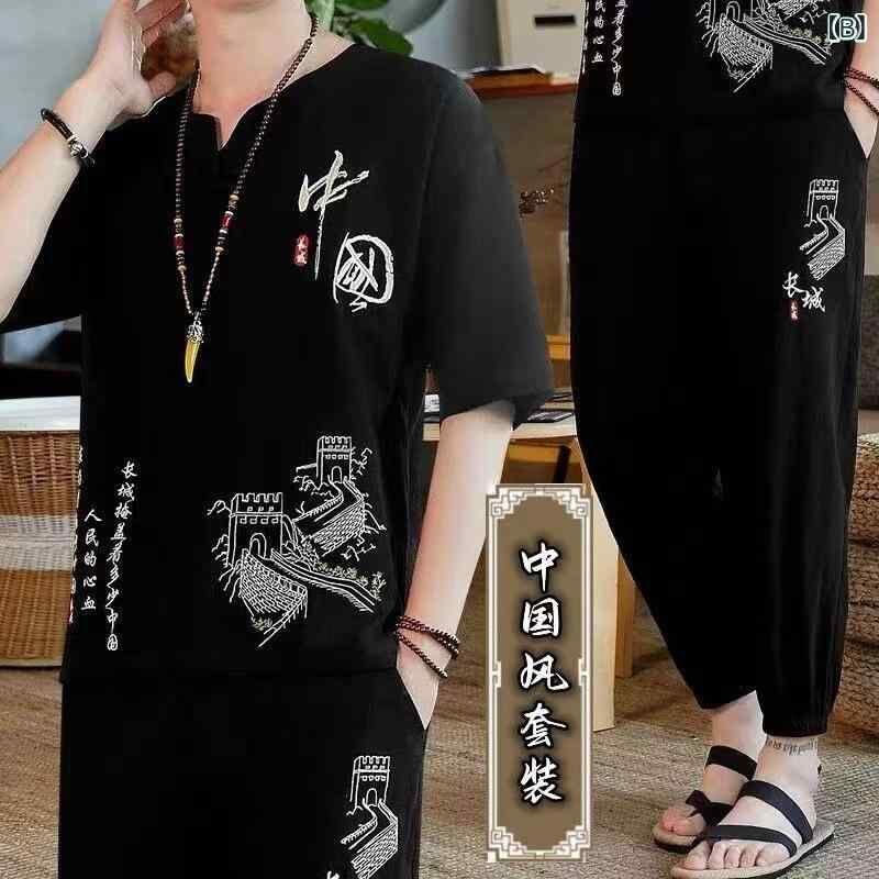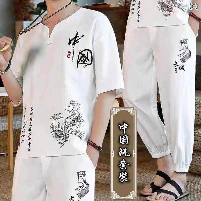 Tシャツ メンズ セットアップ リネン素材 半袖 中国風 レトロ トレンド ゆったり リラックス ロングパンツ カジュアル 普段使い ブラック カーキ ホワイト グレー