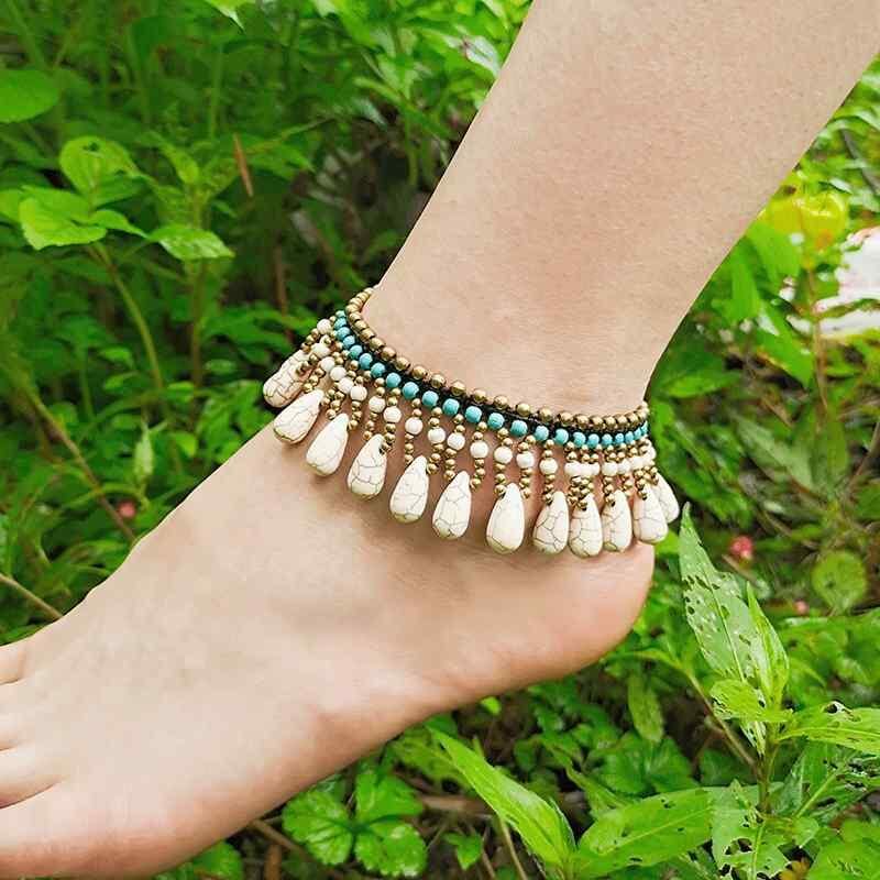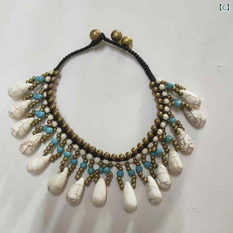 アンクレット レディース 欧米ボヘミアン風 半貴石 水滴型 銅ビーズ タイ製 防水ワックスコード 手編み ビーチ リゾート 夏