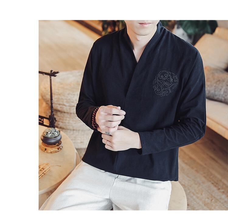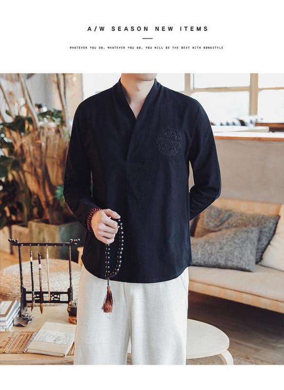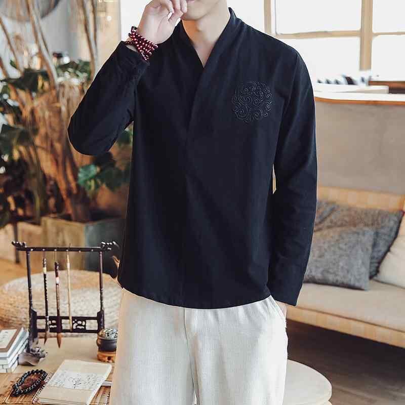 Tシャツ メンズ 春秋 長袖 リネン 綿麻 中国風 禅風 漢服風 レトロ 刺繍 カジュアル リラックスウェア