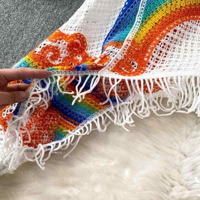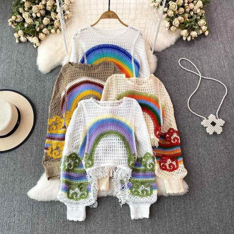 ニット トップス レディース 秋冬 灯籠袖 長袖 かぎ針編み 透かし編み フリンジ デザイン性 ゆったり ルーズ クルーネック 重ね着 プルオーバー 普段使い デイリー 体型カバー ポリエステル