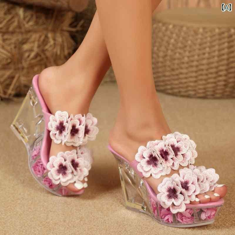 ミュール サンダル シューズ レディース 厚底 11cmヒール ウェッジヒール ダブルストラップ 花柄ヒール クリアソール ポールダンス ナイトクラブ ステージ ラウンドトゥ PUレザー 韓国風 ピンク ホワイト