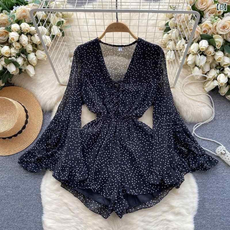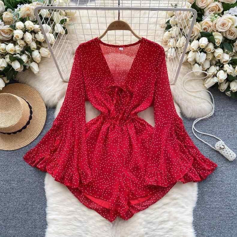 オールインワン レディース トレンド リゾート かわいい フリル フレアスリーブ デザイン リボン Vネック ショート丈 ワイドパンツ 春夏 ポリエステル 五分袖 ハイウエスト 薄手 微ストレッチ